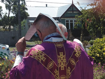 After mass the parish priest was mixing and talking until the last member of the congregation had departed, even though he had to shield his bald pate from the sun using a Columban Calendar. Celebrant after Mass